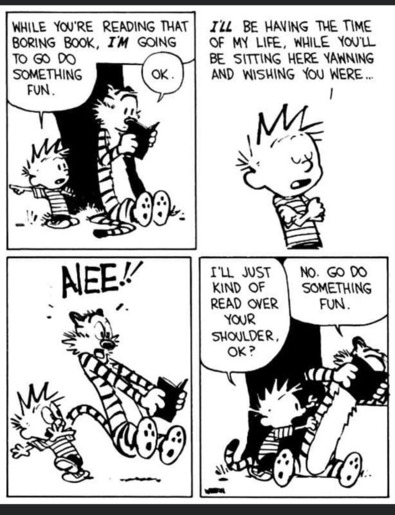 His imaginary games also highlight how children process information. By pretending to be Spaceman Spiff fighting aliens, Calvin is really just dealing with the frustration of a pop quiz. By turning his wagon into a race car, he is experiencing the simple joy of speed and freedom. The strip reminds us that for children, play isn’t a break from learning—it is learning. It’s how they test boundaries, act out their fears, and make sense of a world that is largely controlled by grown-ups . Through Calvin, we remember that a rich inner life is a gift we should never lose.