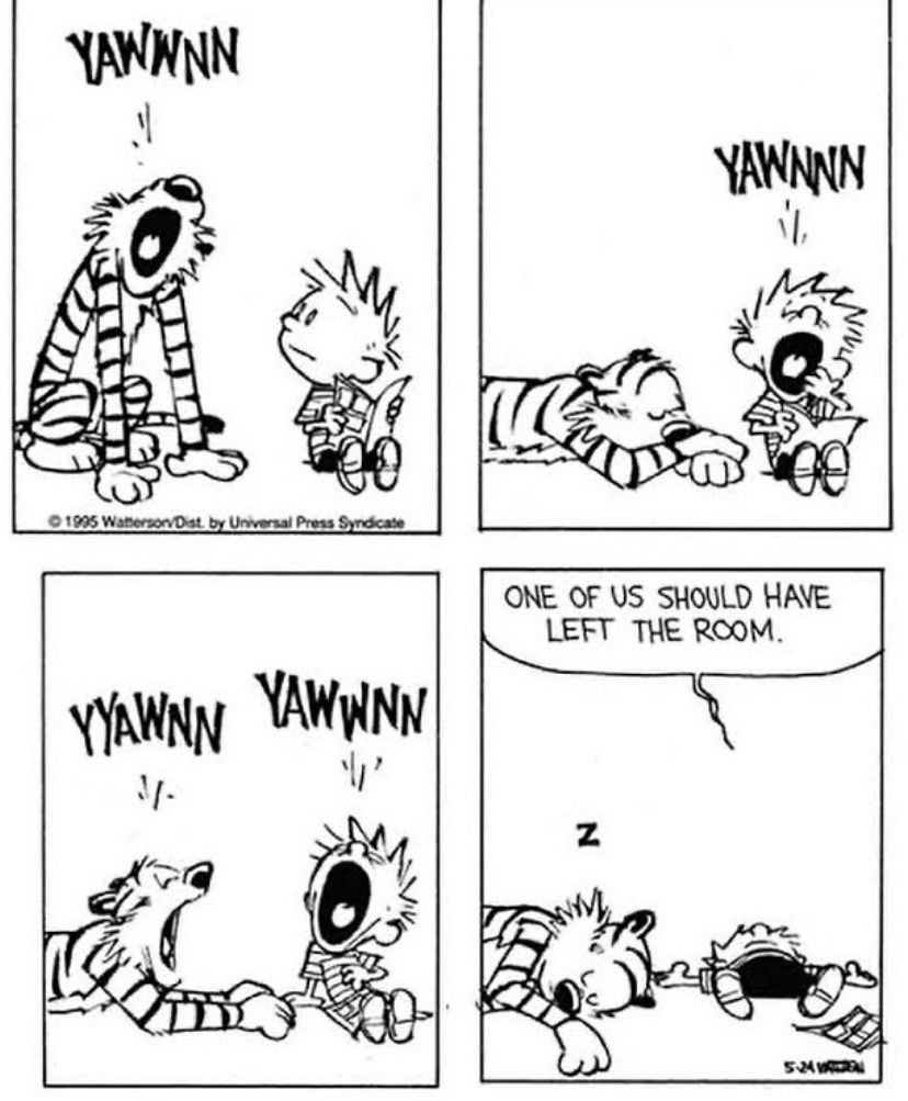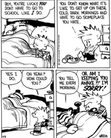 This constant questioning is a key part of the philosophy of childhood. Kids haven’t yet been trained to accept things the way they are. They look at the world with fresh eyes and often notice when things don’t make sense. Calvin and Hobbes encourages us to look at our own lives and ask if we are just going through the motions. Are we doing things because they matter, or just because that’s how they’ve always been done? Calvin’s rebellion against bedtime and homework is really a rebellion against the idea that life has to be dull and serious just because you get older .