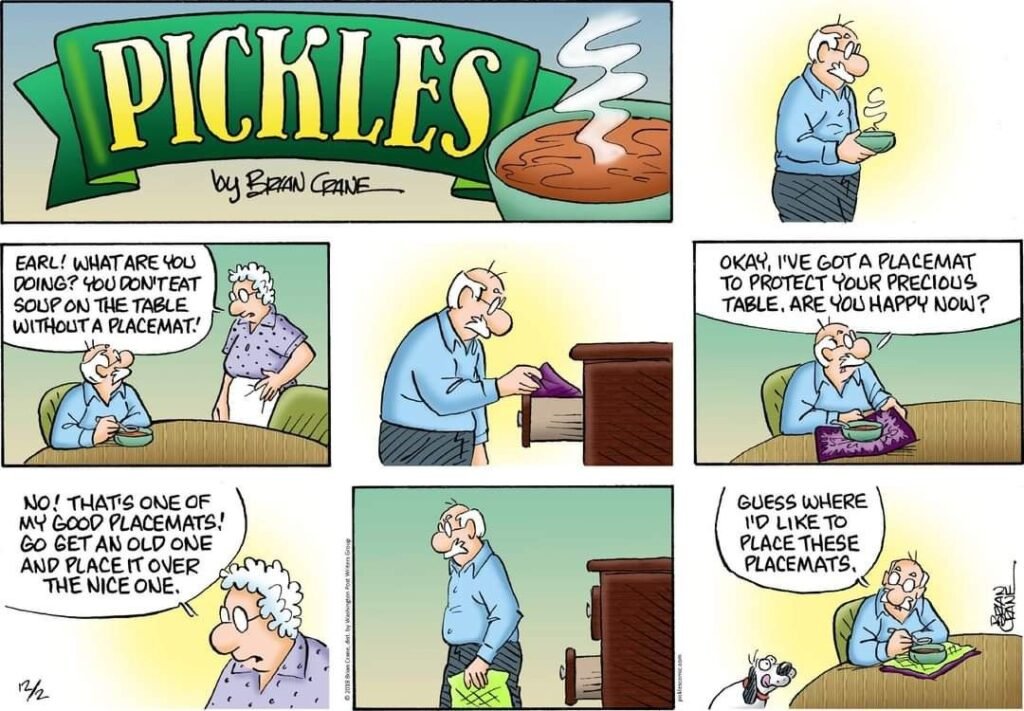 Aging brings its own set of challenges, and “Pickles” addresses them with a grace and humor that is truly special. The strips featuring senior moments —walking into a room and forgetting why, telling the same story twice, misplacing glasses that are on top of their head—are never mean-spirited. Instead, they are moments of shared humanity.