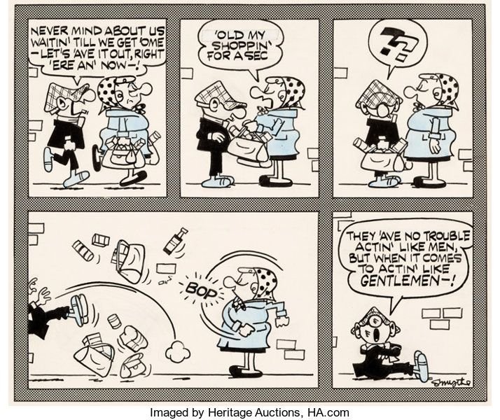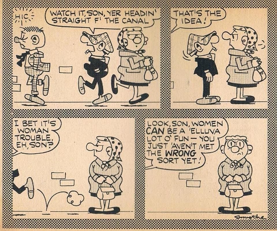 Perhaps the most significant evolution in Andy Capp’s humor has been in his relationship with his wife, Florrie, or Flo. In the early days, their marriage was a comedic battlefield. The humor was slapstick and rough, often featuring Flo hitting Andy over the head with a rolling pin when he stumbled home drunk, or Andy chasing her out of the house in return . While always drawn in a cartoonish and stylized way, this portrayal of domestic strife started to feel less funny and more uncomfortable as society’s understanding of domestic violence grew .
