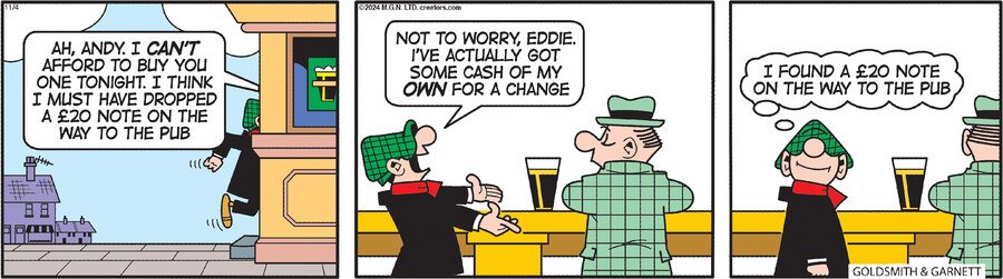 The humor in these scenes is rich and layered. It’s in the camaraderie between Andy and his mates as they discuss football, the weather, and the state of the world with the authority of men who have it all figured out (and probably don’t). It’s in the tall tales Andy tells about his non-existent exploits and the elaborate schemes he hatches to win a bet or earn a few extra quid. This is a perfect, loving depiction of pub culture and working-class life. The pub isn’t just a place to drink; it’s a refuge, a social club, and a second home. For Andy, it’s a place where he can be himself, surrounded by people who understand him. These strips are funny because they’re so authentic, capturing the unique blend of sarcasm, gossip, and genuine friendship that makes the local pub such a special place.