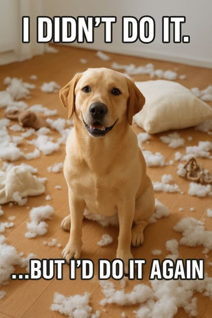 Another fan favorite is the “guilty dog” meme. You come home to find your pillow shredded, and your dog is sitting in the middle of the mess with a look that says, “The cat did it.” Even if you don’t have a cat. Their ability to look guilty and innocent at the exact same time is a talent. It’s that classic “homework eater” expression—they know they messed up, but they are hoping their cuteness will save them .