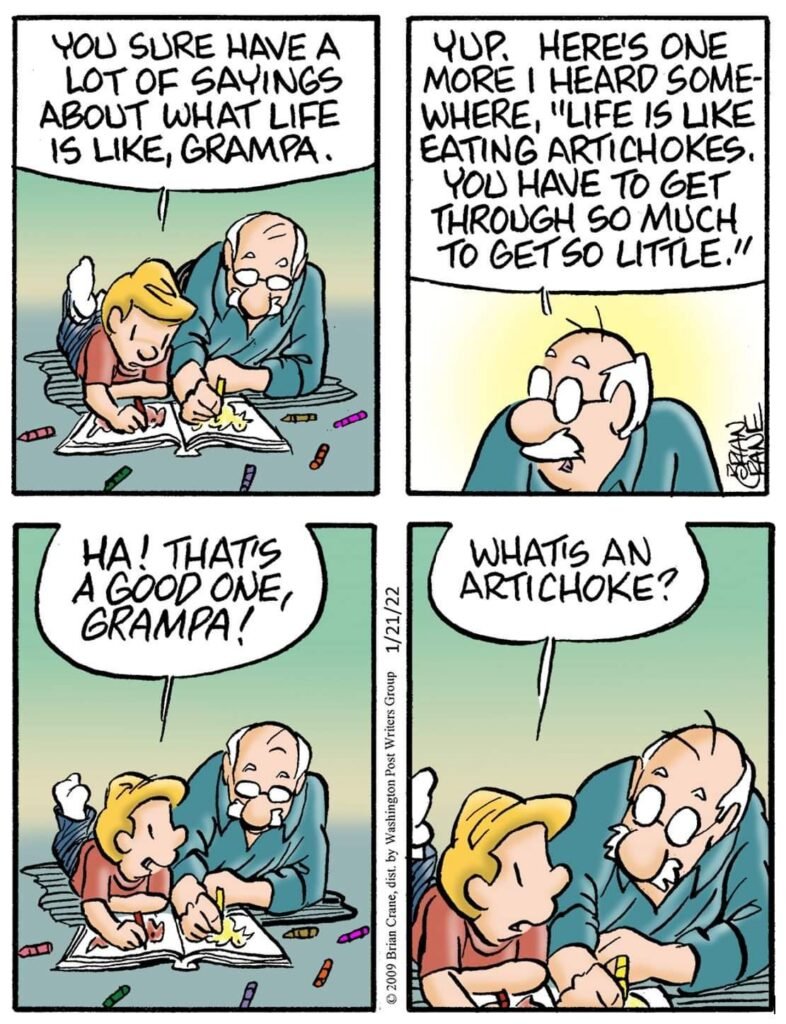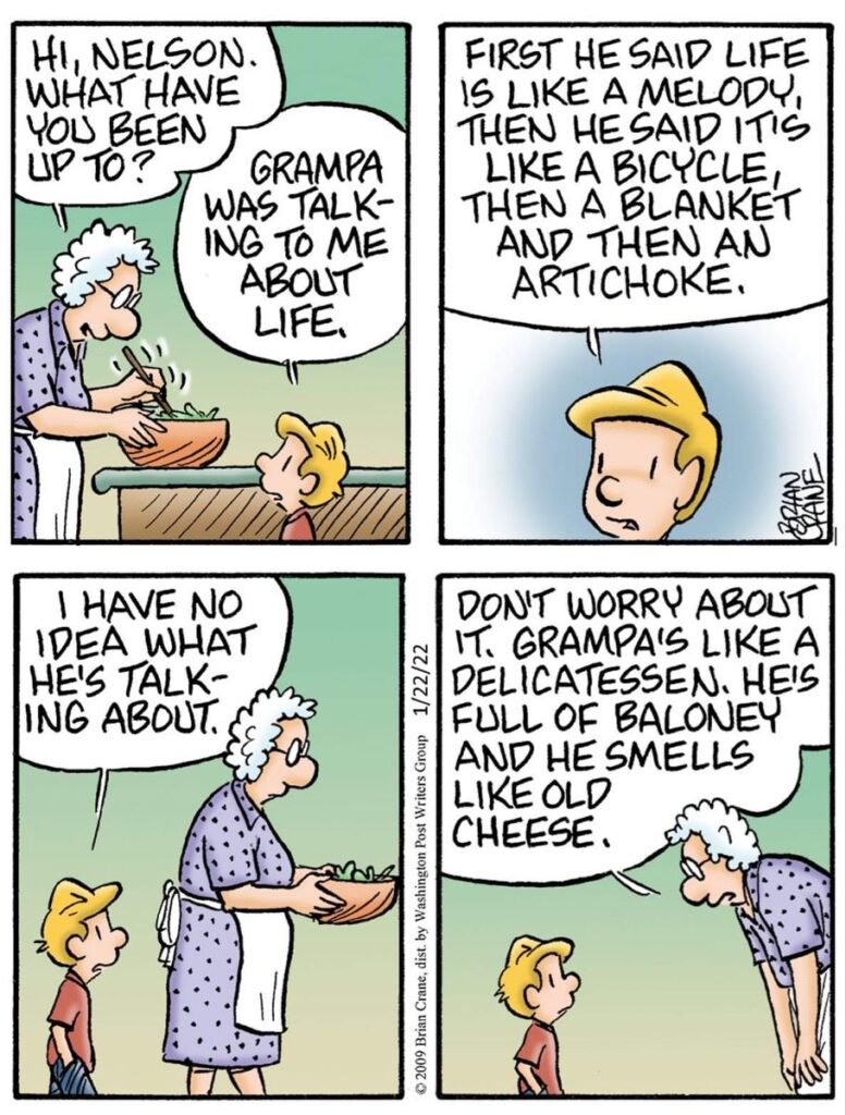 When Nelson struggles to understand why Grandpa uses such “old-timey” words, the comic doesn’t just poke fun at the elderly. Instead, it shows how family traits are passed down. After Nelson complains about Grandpa’s vocabulary, he turns to Grandma for an explanation. In trying to define the words, Opal realizes she sounds exactly like her husband . It is a subtle and beautiful way of showing that spending a lifetime with someone means you start to become like them.