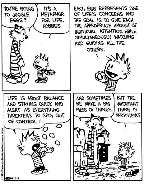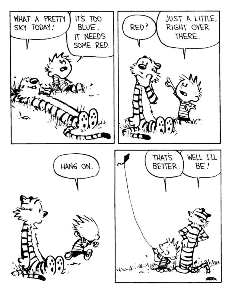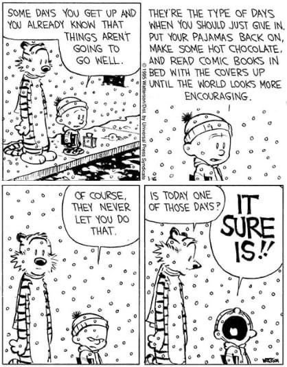 If you haven’t picked up a Calvin and Hobbes book since you were a kid, I highly recommend you do so. You might be surprised to find that you aren’t just re-reading an old comic strip; you are re-discovering a part of yourself that you thought you had lost. You might just learn, like I did, that the world looks a little brighter, a little more magical, and a little more manageable when you try to see it through the eyes of a six-year-old and his best friend.