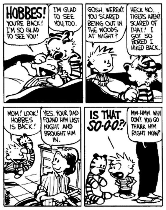At the heart of the strip lies one of the most unique relationships ever committed to paper. On the surface, it is simple: Calvin is a young boy, and Hobbes is his stuffed tiger. But within the panels of the comic, Hobbes is very much alive—a witty, thoughtful, and sometimes sarcastic companion who helps Calvin navigate the confusing world of adults . This dual reality is the genius of the strip. To Calvin, Hobbes is a real tiger who pounces on him when he gets home from school; to everyone else, he is just a lifeless doll. Watterson masterfully leaves this ambiguity up to the reader, inviting us to see the world through the eyes of a child .